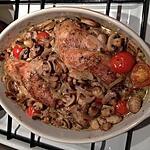 dans la poële a la place des oignons mettre les champignons , laissé l'eau s'évaporée , mettre les champignons sur les cuisses et passé au four ( 30 a 40 mn suivant four a 170°) .