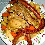 DANS UNE COCOTTE FAIRE DORER LAPIN ET POULET ET 1 MEREGUEZ COUPEE EN MORCEAUX SALEZ POIVREZ AJOUTEZ OIGNON ET AIL PUIS LES EPICES ET DU CONCENTRE DE TOMATE ET RECOUVRIR AVEC DE L'EAU. LAISSEZ MIJOTER 40 MINUTES.